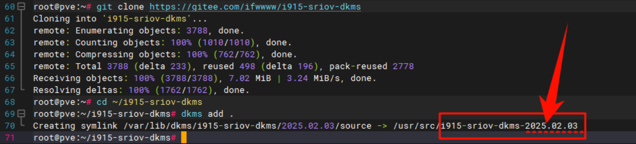 这里记录出现的i915-sriov-dkms版本号,比如此时示范时如上图所示版本号为“2025.02.03”(该版本号会变,请以你的实际版本为准),将下面这行代码中的汉字替换为你的版本号再运行代码: