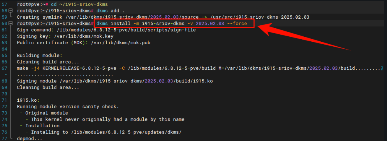 dkms install -m i915-sriov-dkms -v 把这里换成版本号 --force这个运行需要一点时间,请耐心等待,如下图所示: