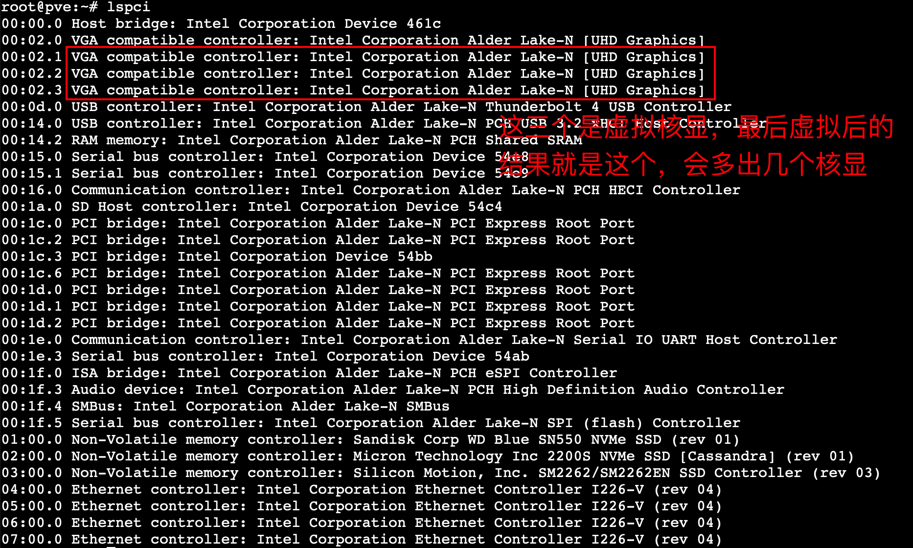 lspci | grep VGA将上面记录的核显ID替换下面代码中的0000:00:02.0(有可能没有显示0000:,下面的代码中补全即可),sriov_numvfs = 3 中的 3 是需要虚拟的核显数量,需要和上面的设置的数量相同